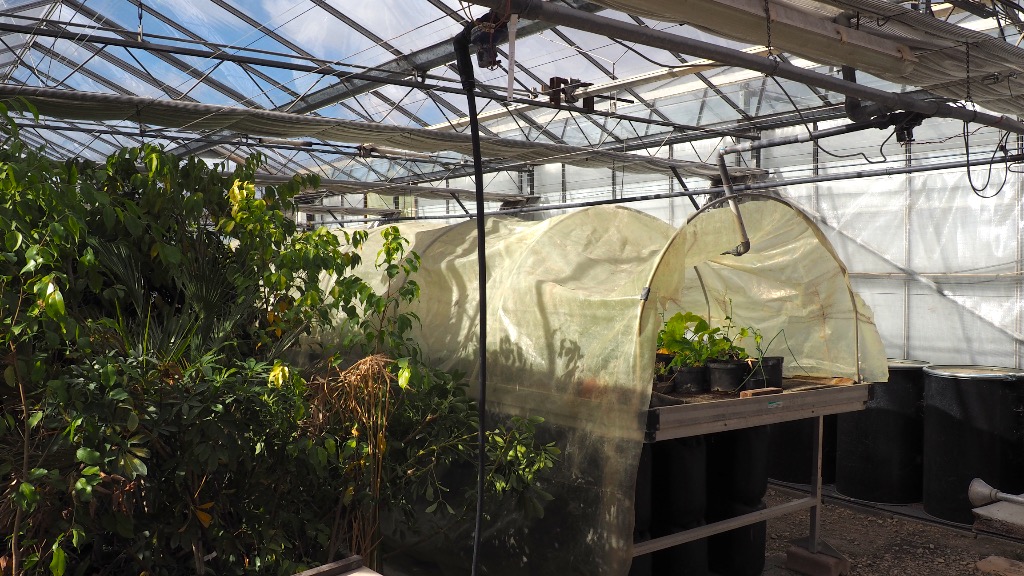 Quelques vestiges horticoles. Au plafond l’écran thermique se referme lors d’un passage nuageux.